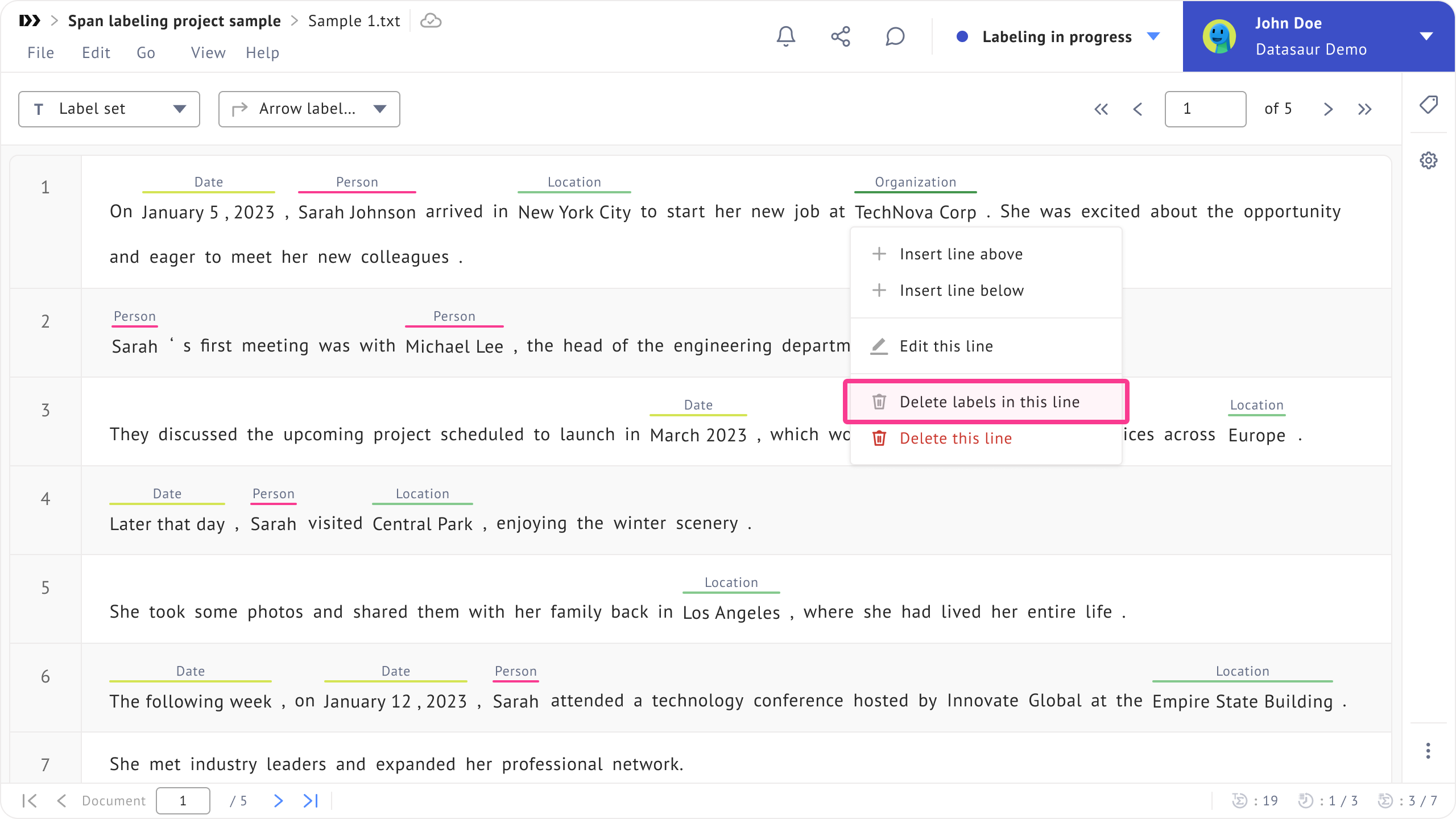 You can delete all the labels on a given sentence by right-clicking anywhere in the sentence and choosing **Delete Sentence Labels**.