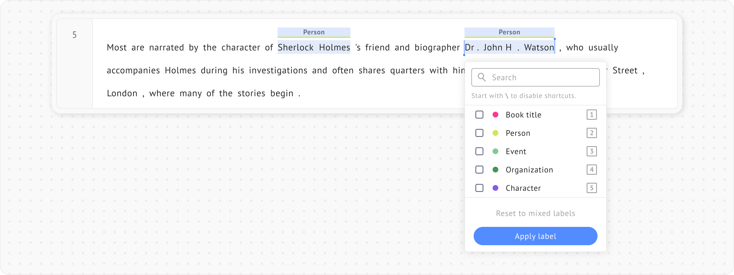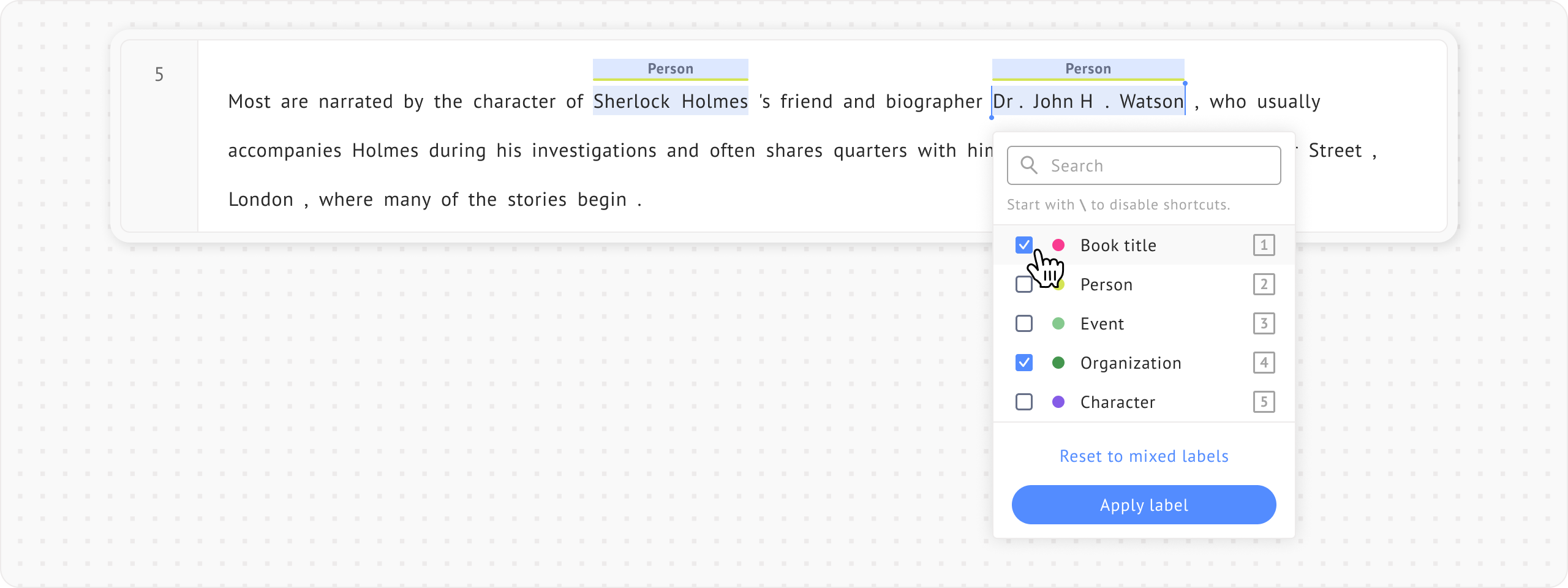 * If `Sherlock Holmes` and `Dr. John Watson` doesn’t have any labels applied, you can simply select the appropriate labels, then click “Apply labels” button. Those labels will be applied to both spans.