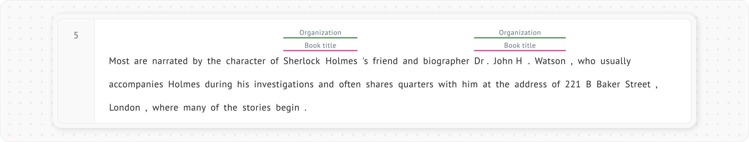 4. **ORGANIZATION** and **BOOK TITLE** labels will be applied to `Sherlock Holmes` and `Dr. John Watson`