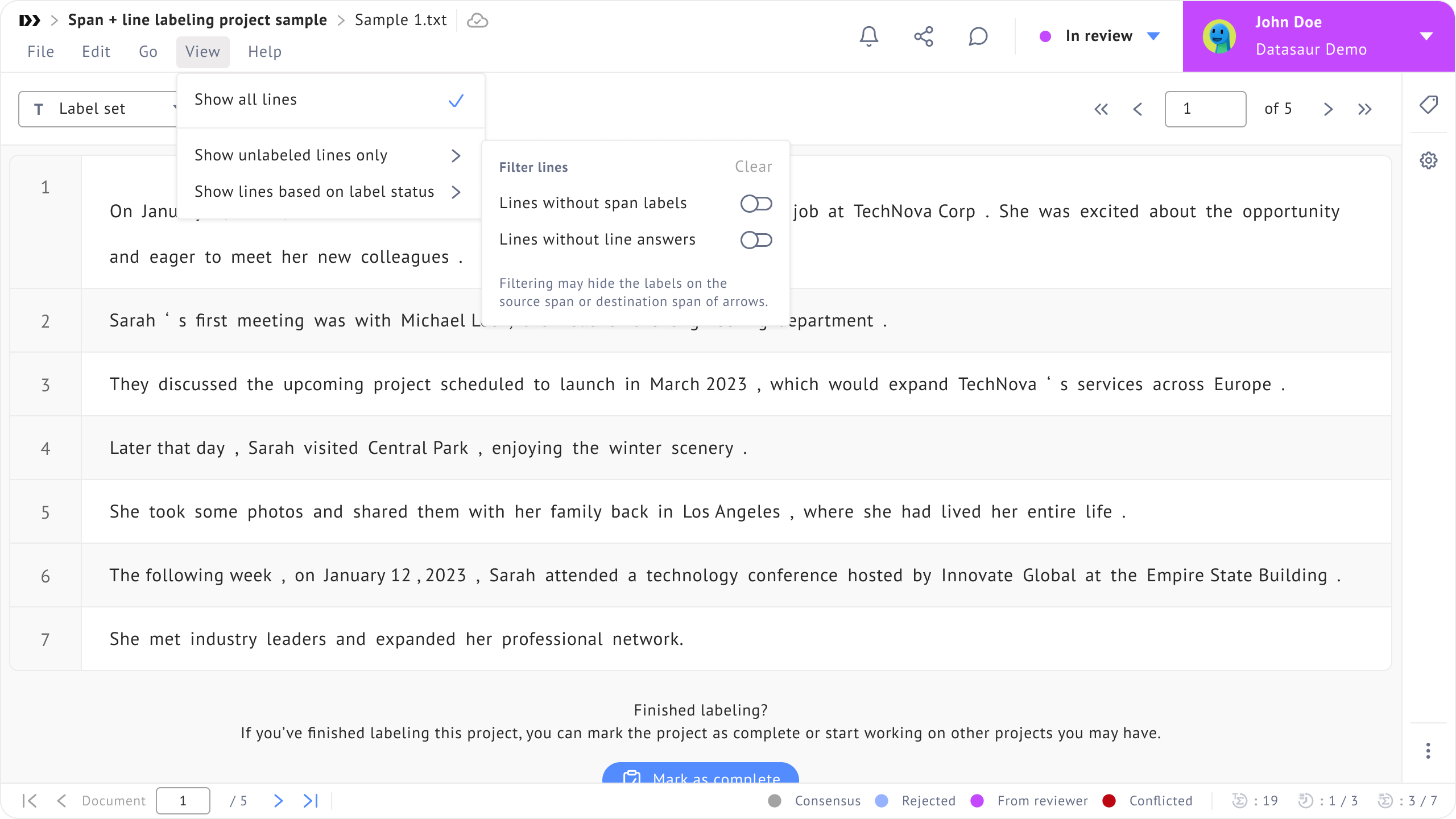 Once you have finished labeling, click **Mark as complete**. This will signify to your team you are done with the project, and it is ready for **Review** or **Export**.
