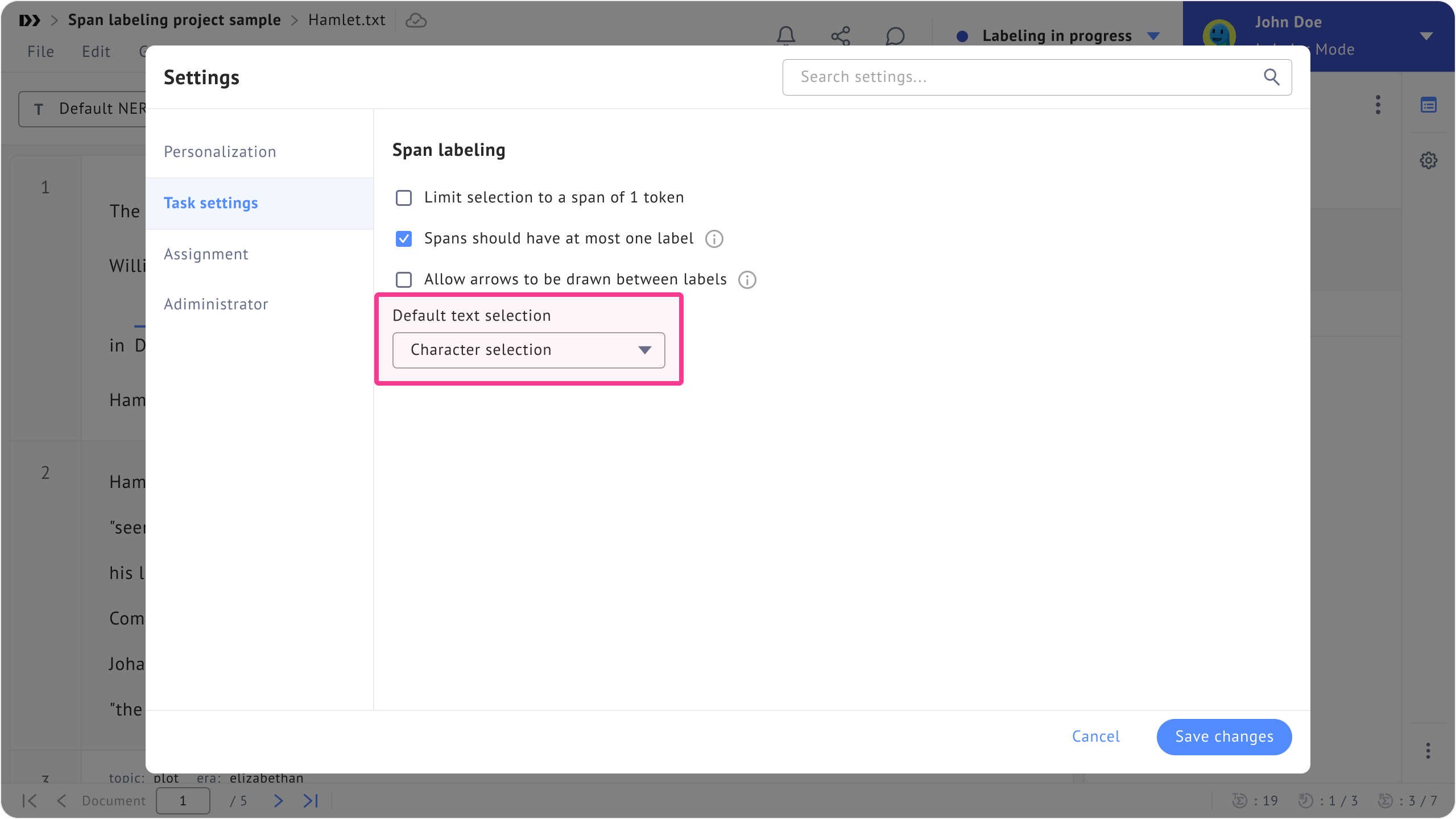 <figure><img src="https://448889121-files.gitbook.io/~/files/v0/b/gitbook-x-prod.appspot.com/o/spaces%2F-MbjY0HseEqu7LtYAt4d%2Fuploads%2Fgit-blob-d799ff313147cf8250ef4c778efb7e806595a42a%2FProject%20settings%20-%20span%20labeling%20-%20task%20settings%20-%20default%20text%20selection%20-%20character%20selection.png?alt=media" alt=""><figcaption><p>Task settings will show in the personal workspace and in the reviewer mode under the team workspace.</p></figcaption></figure>