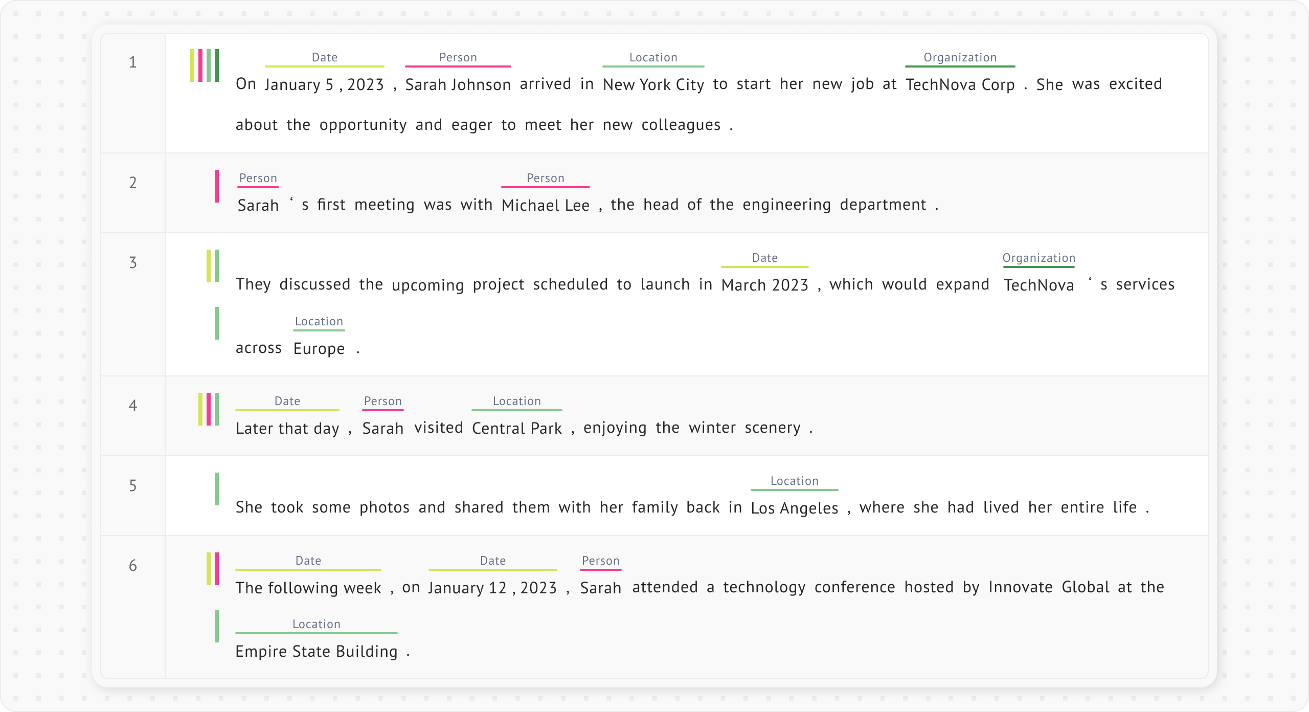 **Paragraph/sentence labeling** optimizes the interface for when you are applying labels to longer sentences or entire paragraphs. You will have the option to show the label as an index bar on the left-hand side, and hide the label above the text to avoid clutter.
