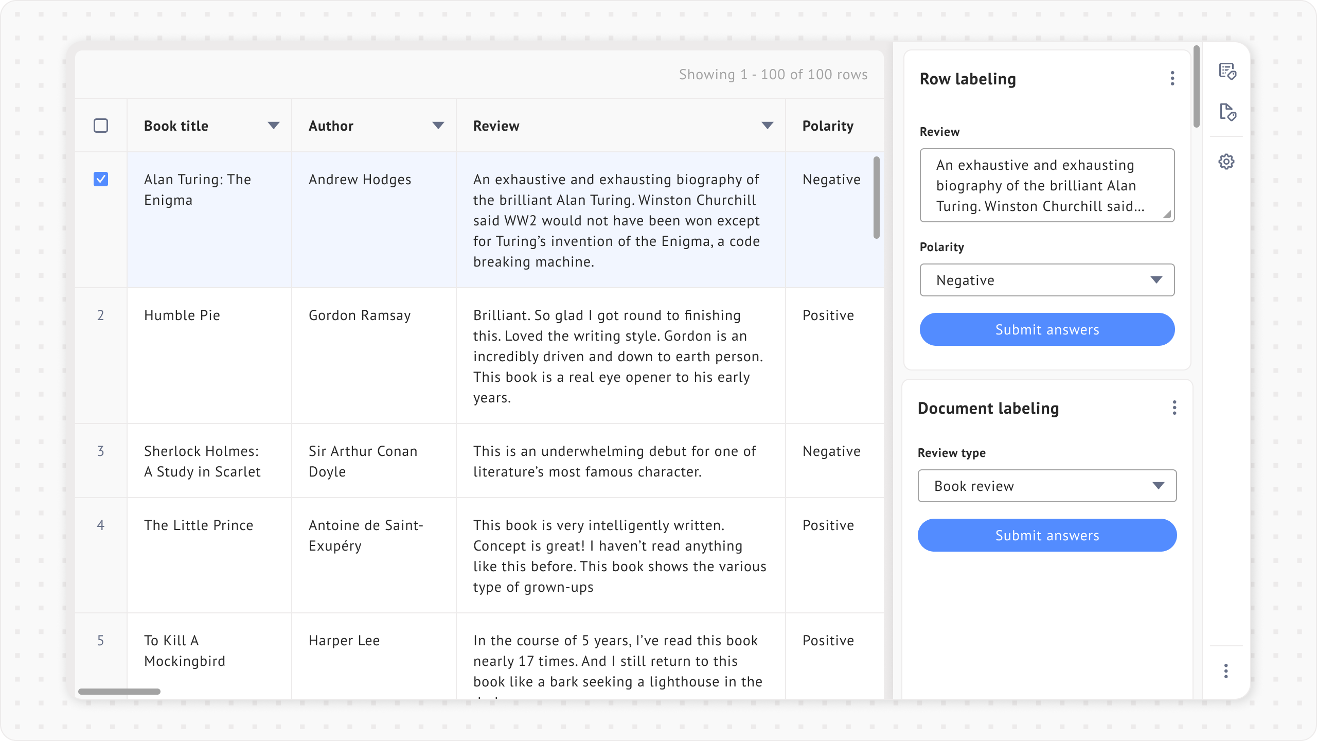 This allows you to label individual rows in a structured dataset (such as a table or spreadsheet) while also classifying the entire document. In row labeling, you answer predefined questions about each row based on its content, while document labeling assigns an overall category to the dataset or file.
