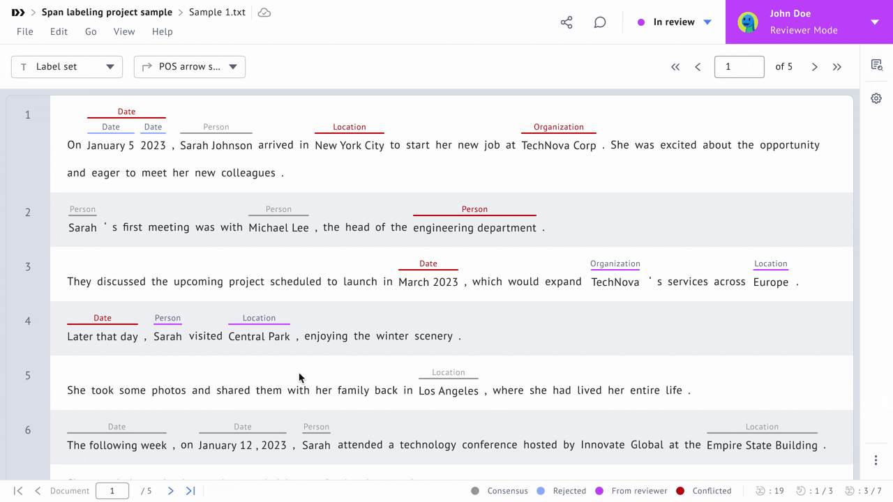 <figure><img src="https://448889121-files.gitbook.io/~/files/v0/b/gitbook-x-prod.appspot.com/o/spaces%2F-MbjY0HseEqu7LtYAt4d%2Fuploads%2Fgit-blob-f662bdbb385373691ad9af0b7a3eeaee5f133816%2FProject%20-%20span%20labeling%20-%20status%20bar%20-%20reviewer%20mode%20-%20highlight%20label%20colors.png?alt=media" alt=""><figcaption></figcaption></figure>