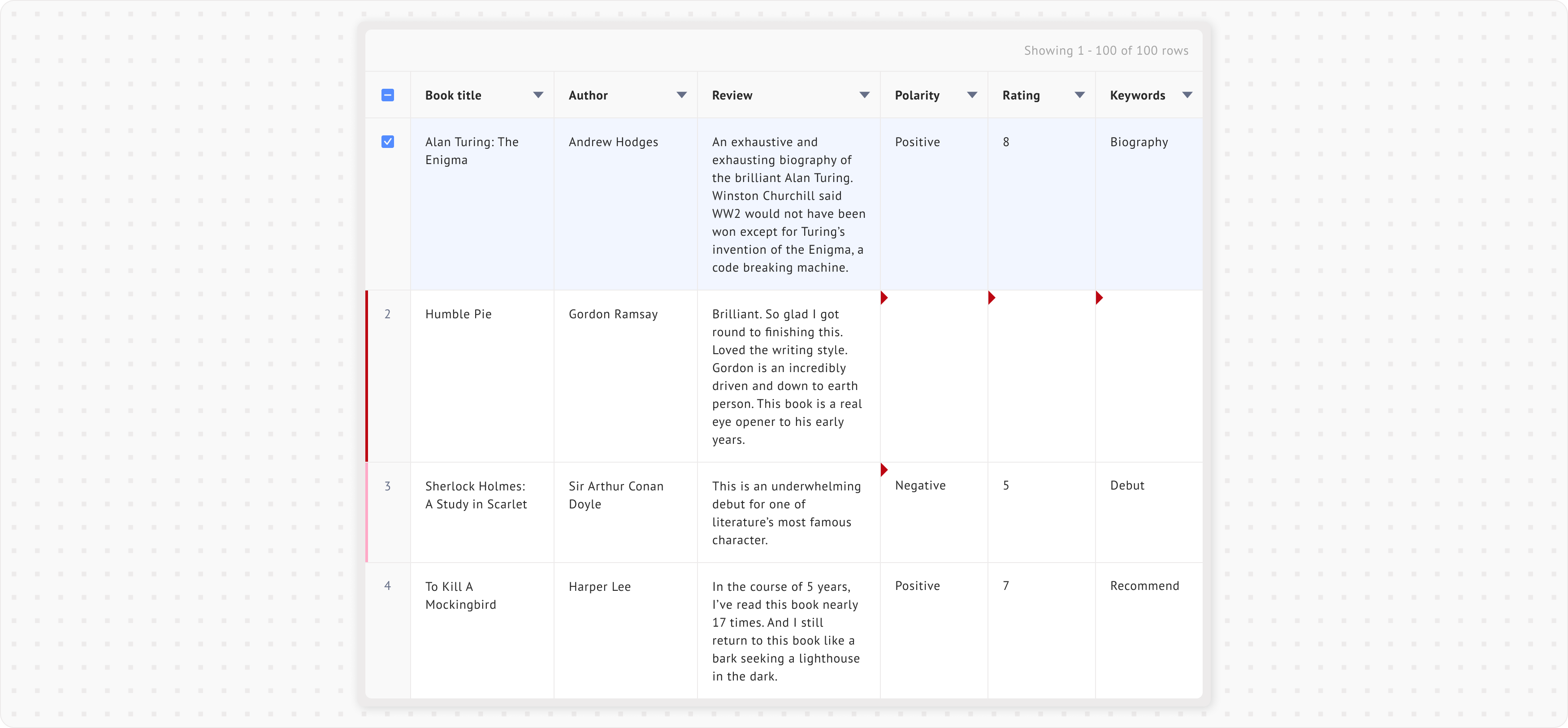 Unlike span labeling, the reviewing process in row labeling involves accepting answers within the Document and Row Labeling extension. When reviewing a row labeling project, there are two primary things: