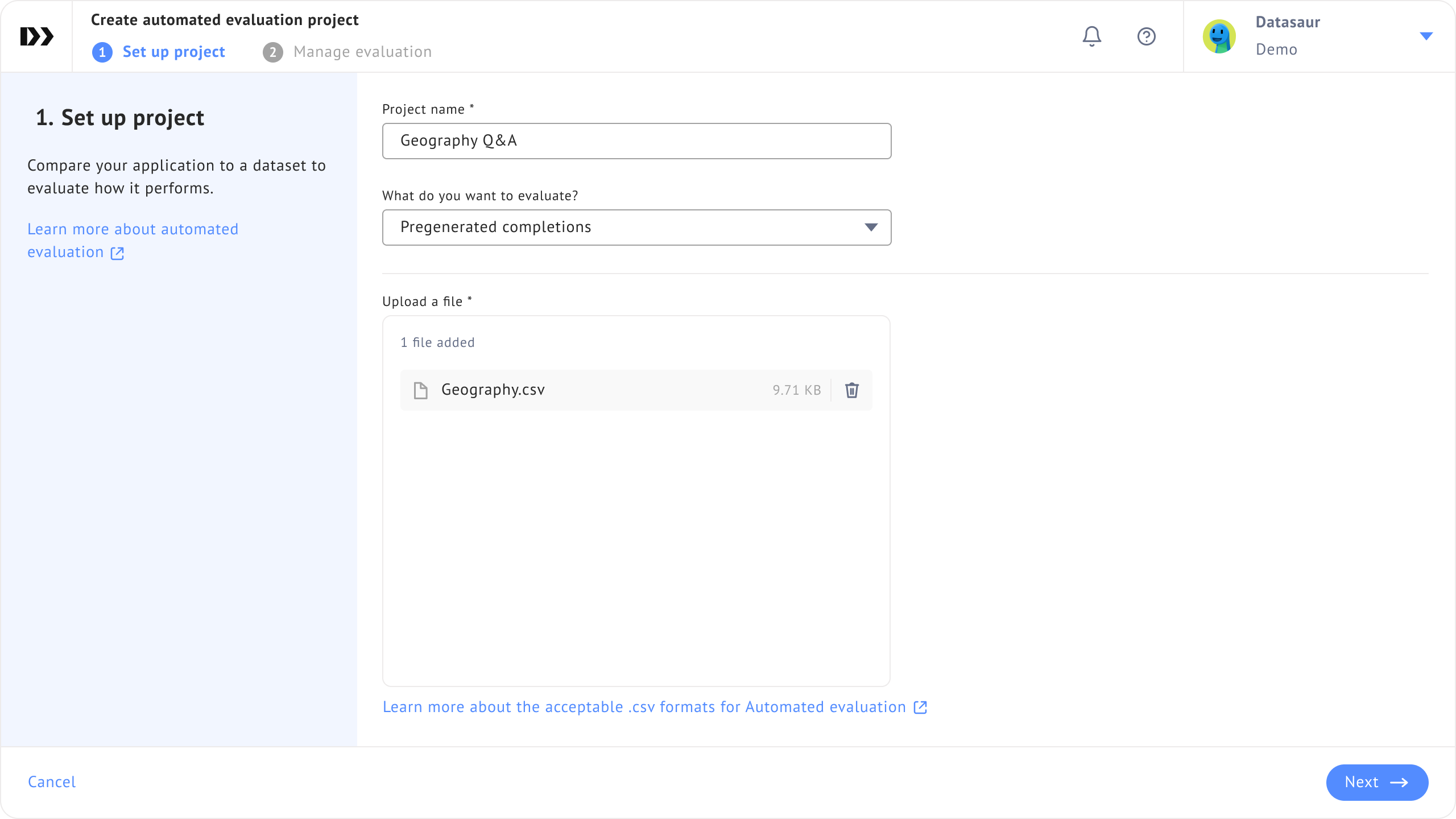 3. Configure your evaluation project. You can evaluate two types with automated evaluation: