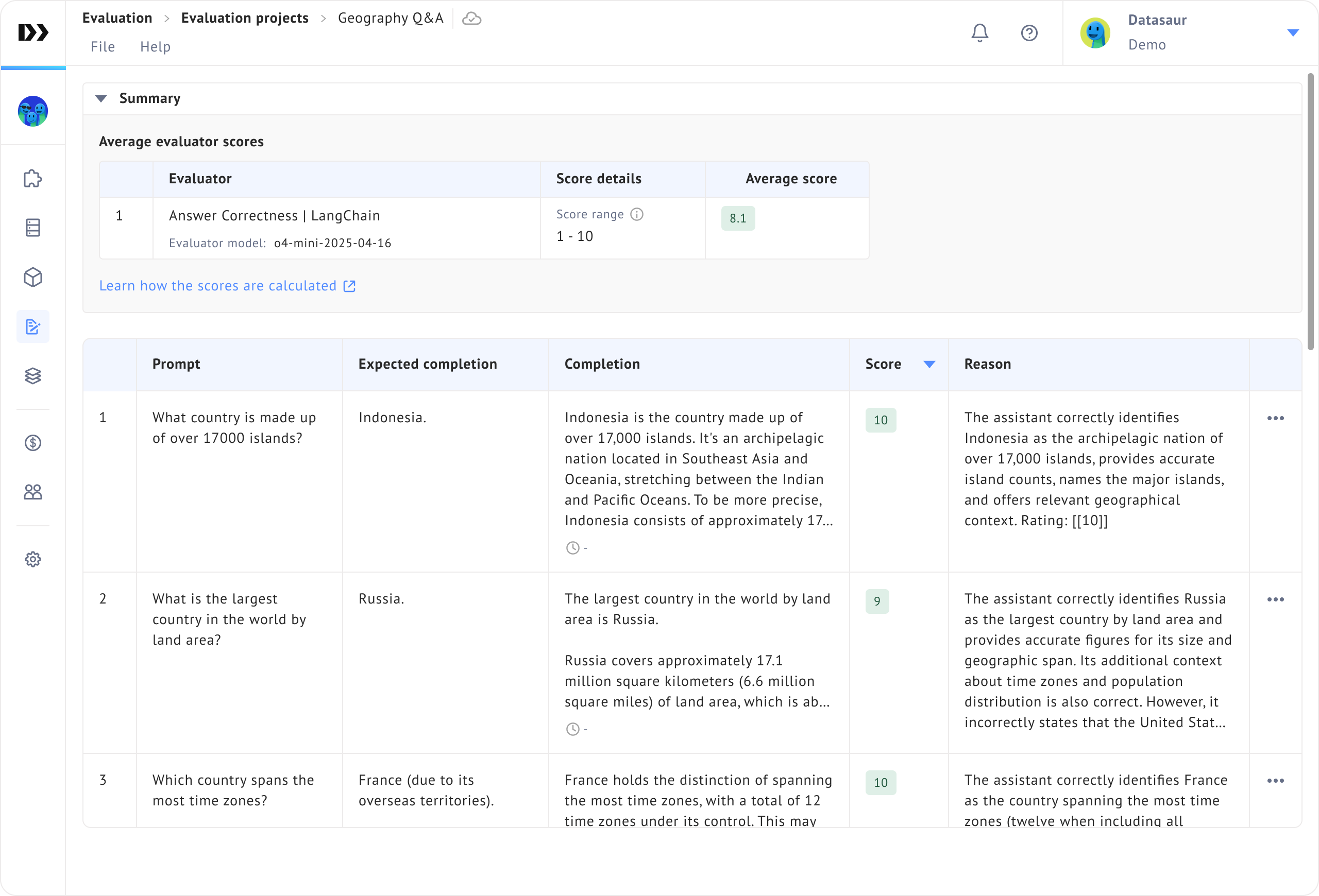* Upload the pre-generated completions combined with the ground truth dataset in a CSV format with three columns: `prompt`, `completion`, and `expected completion`.