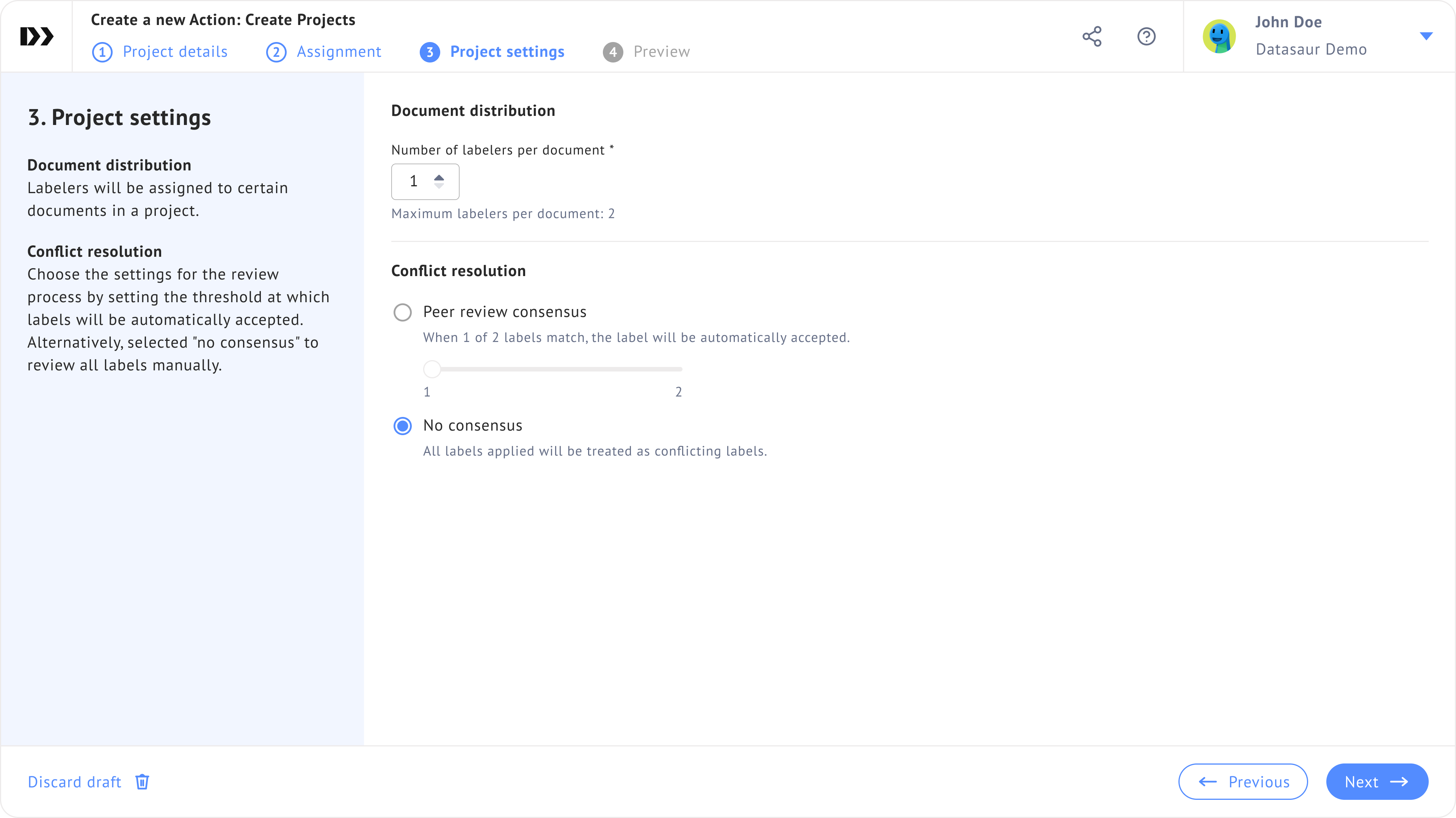 Number of labelers per project. Each time a project is created with this Action, this field will determine how many labelers (from all the selected labelers above) will be assigned to the project. If it's lower than the total number of labelers, the assignment would be distributed using a round-robin algorithm.