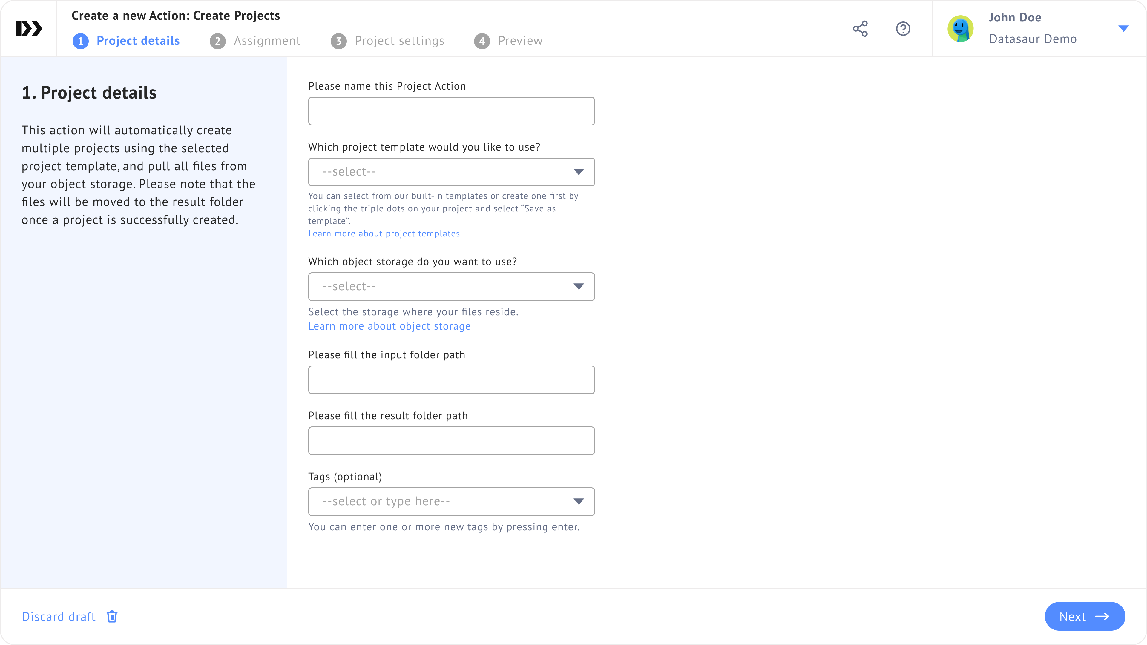 Tags (optional). You can add custom tags to each project that is created through the Action by filling this field.