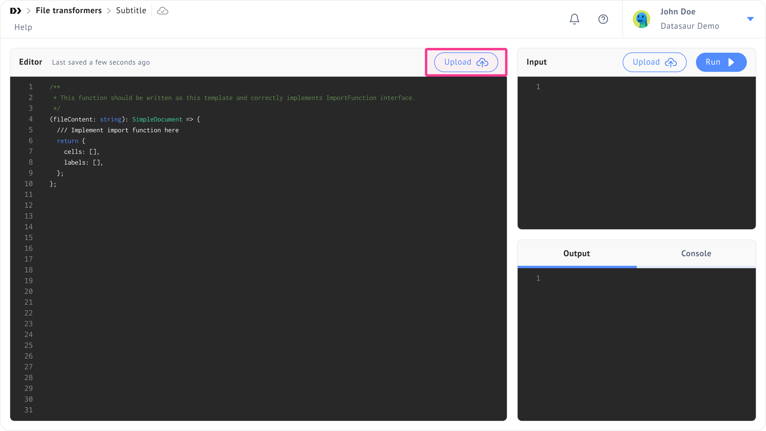 * As a user, you can upload the file transformer using the upload button on the right side of the editor.
