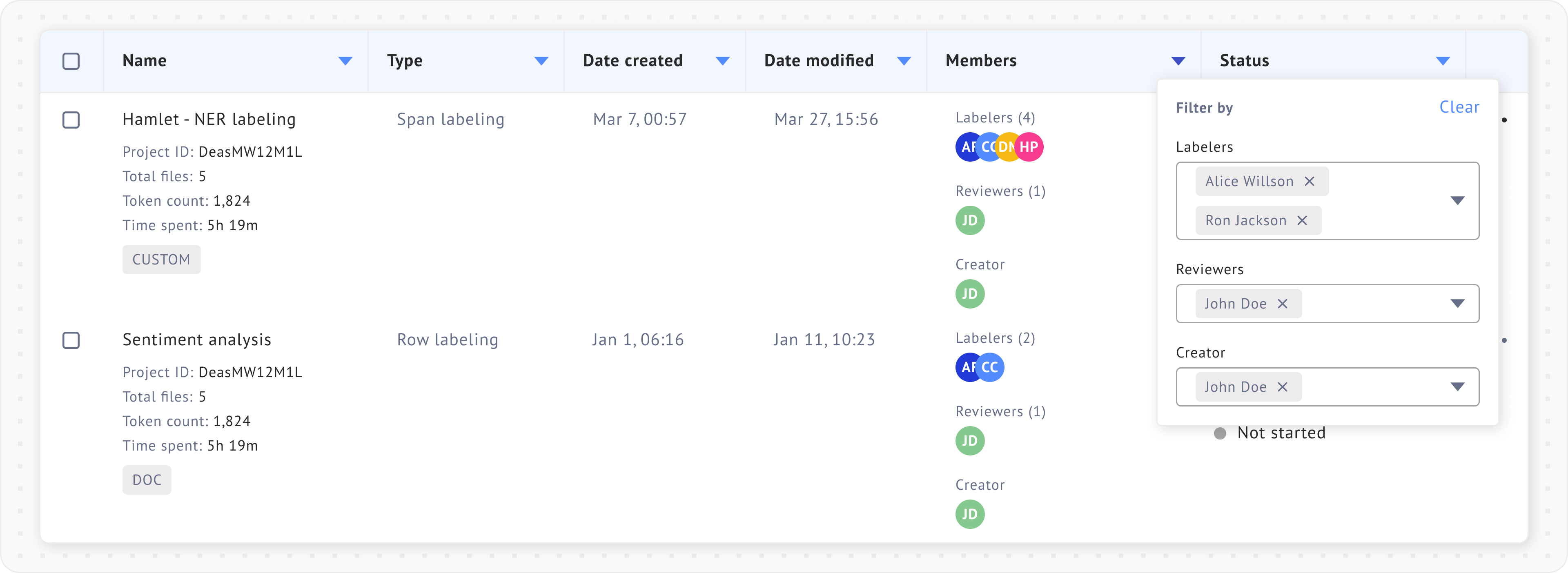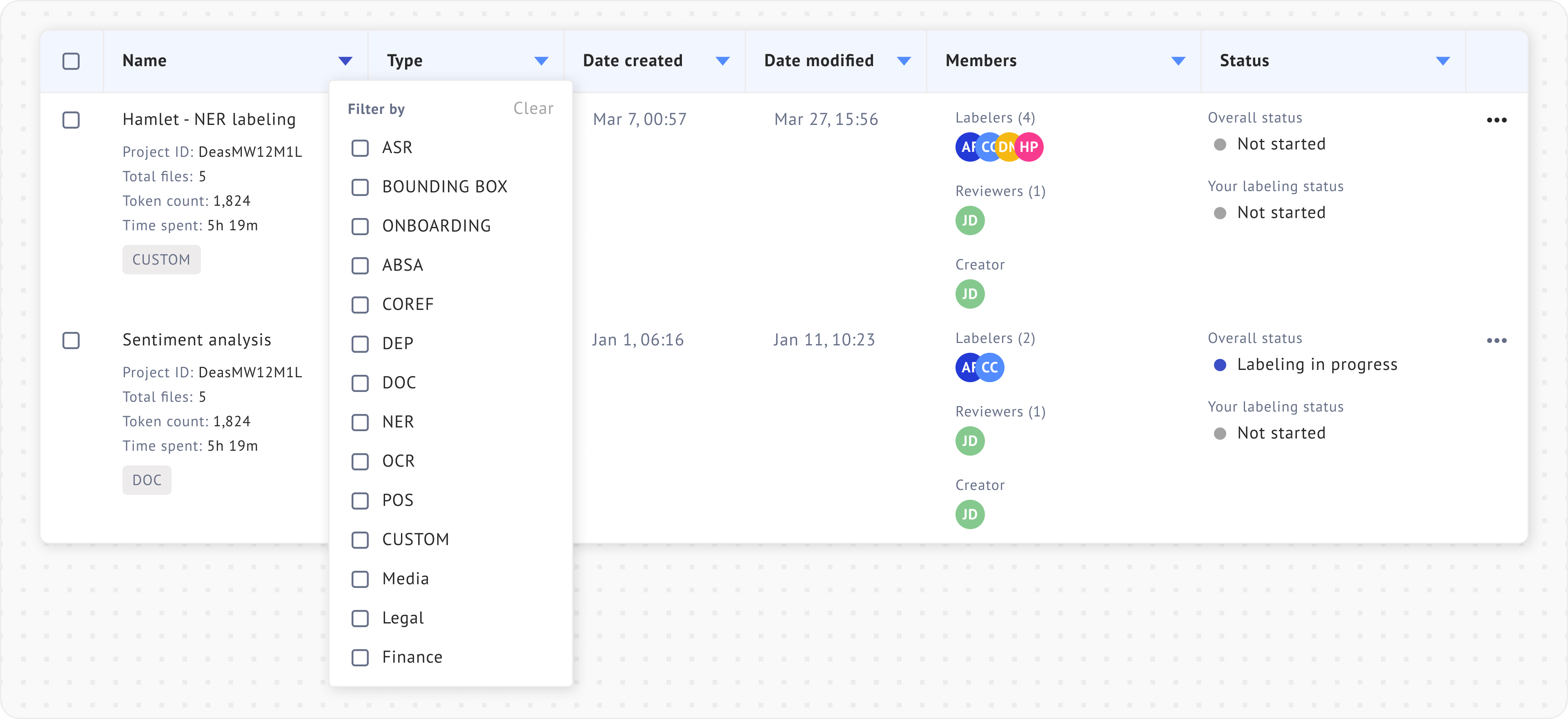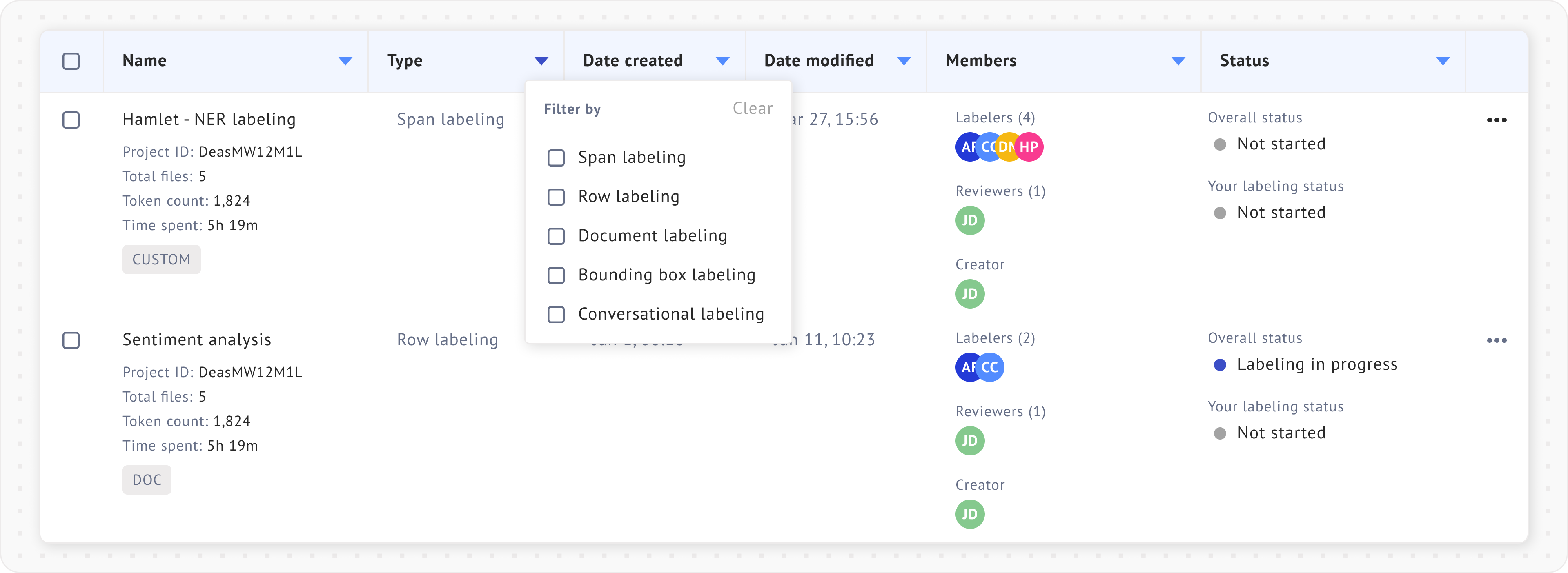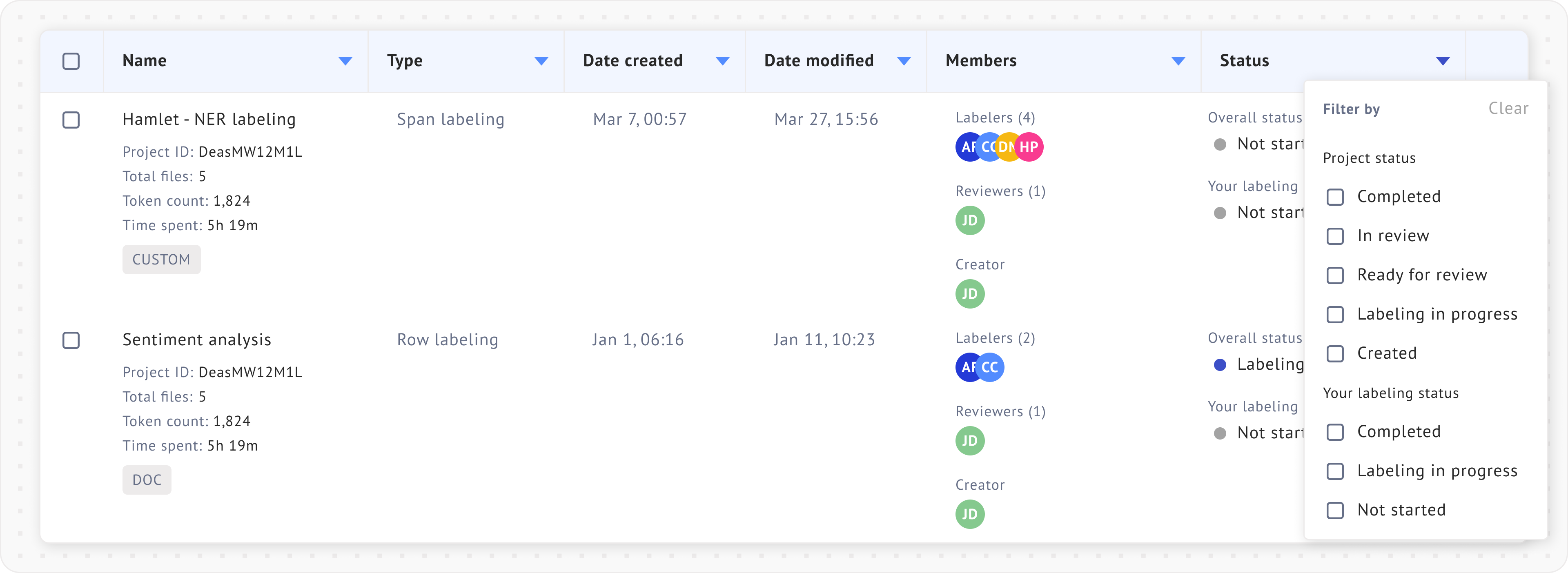 Filtering projects by labelers and status can be useful in [team projects](https://docs.datasaur.ai/workspace-management/workspace). The detailed definitions of each status type can be found [here](https://docs.datasaur.ai/workspace-management/project-management/project-status-workflow).