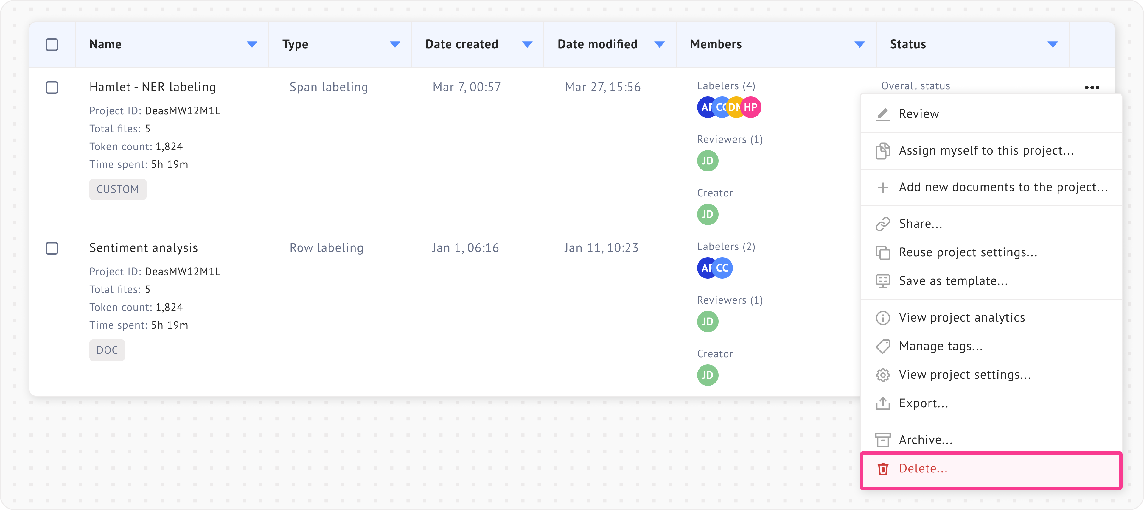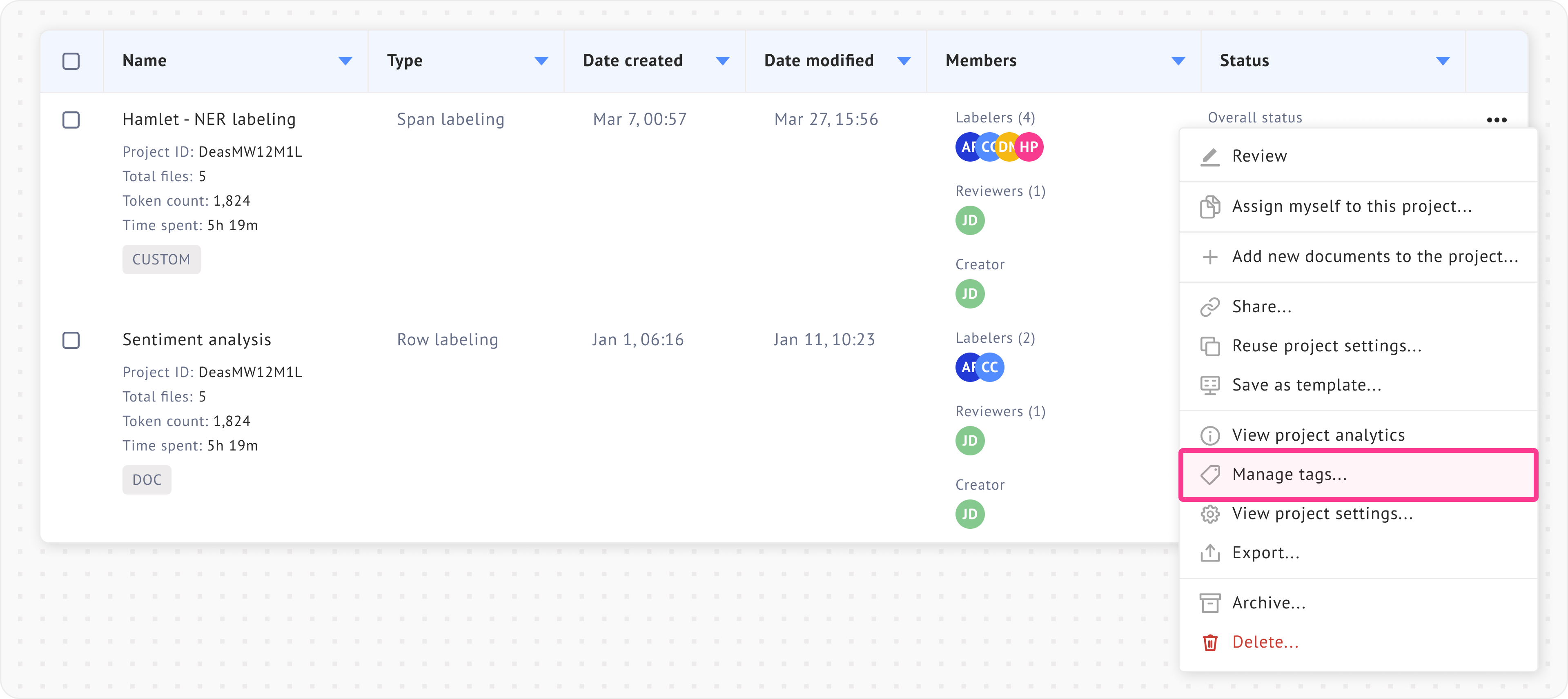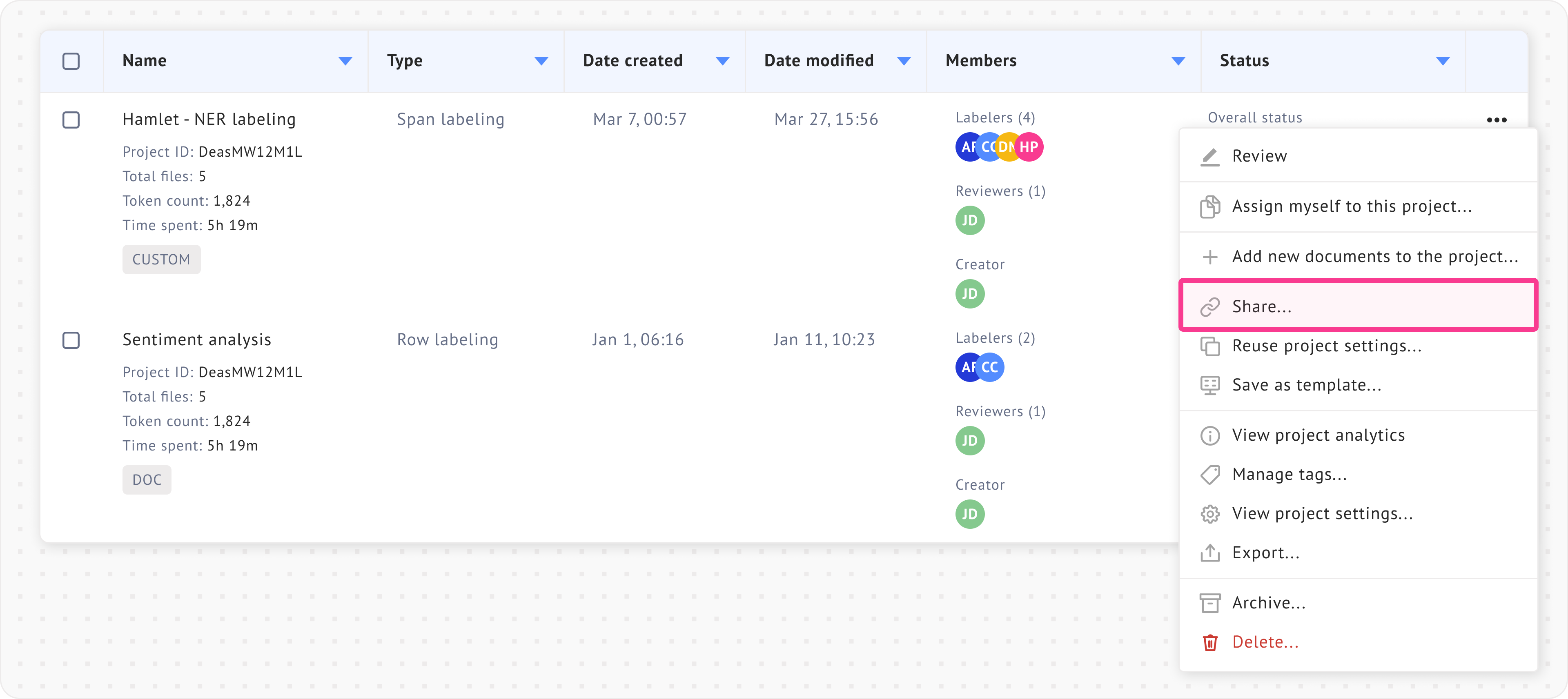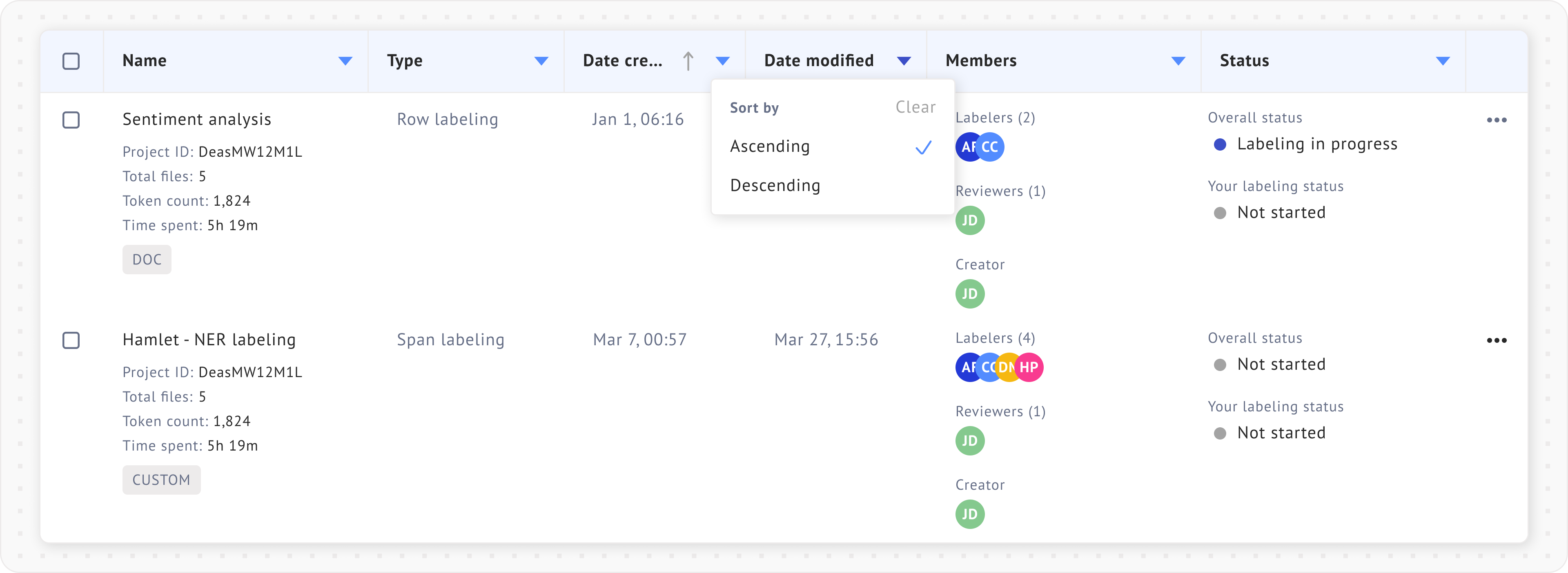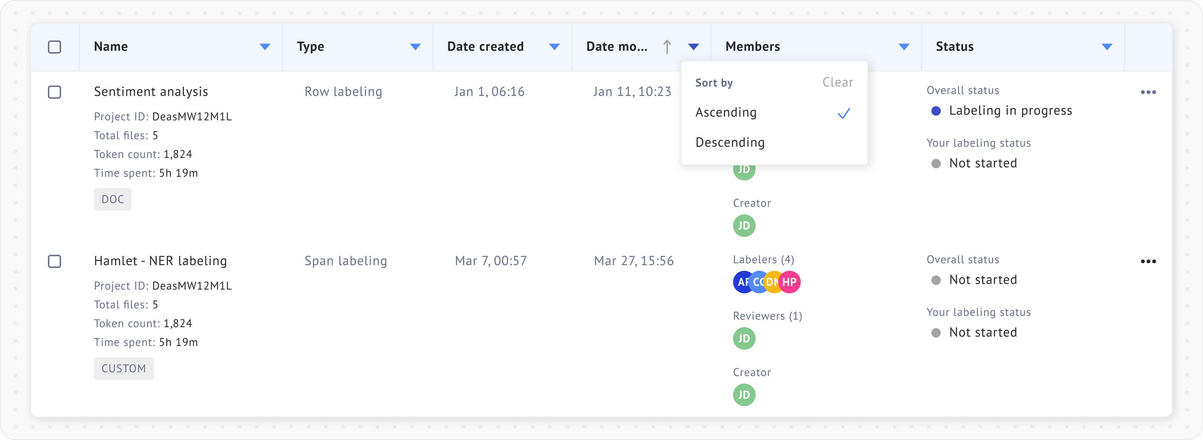 Filtering projects by labelers and status can be useful in [team projects](https://docs.datasaur.ai/workspace-management/workspace). The detailed definitions of each status type can be found [here](https://docs.datasaur.ai/workspace-management/project-management/project-status-workflow).