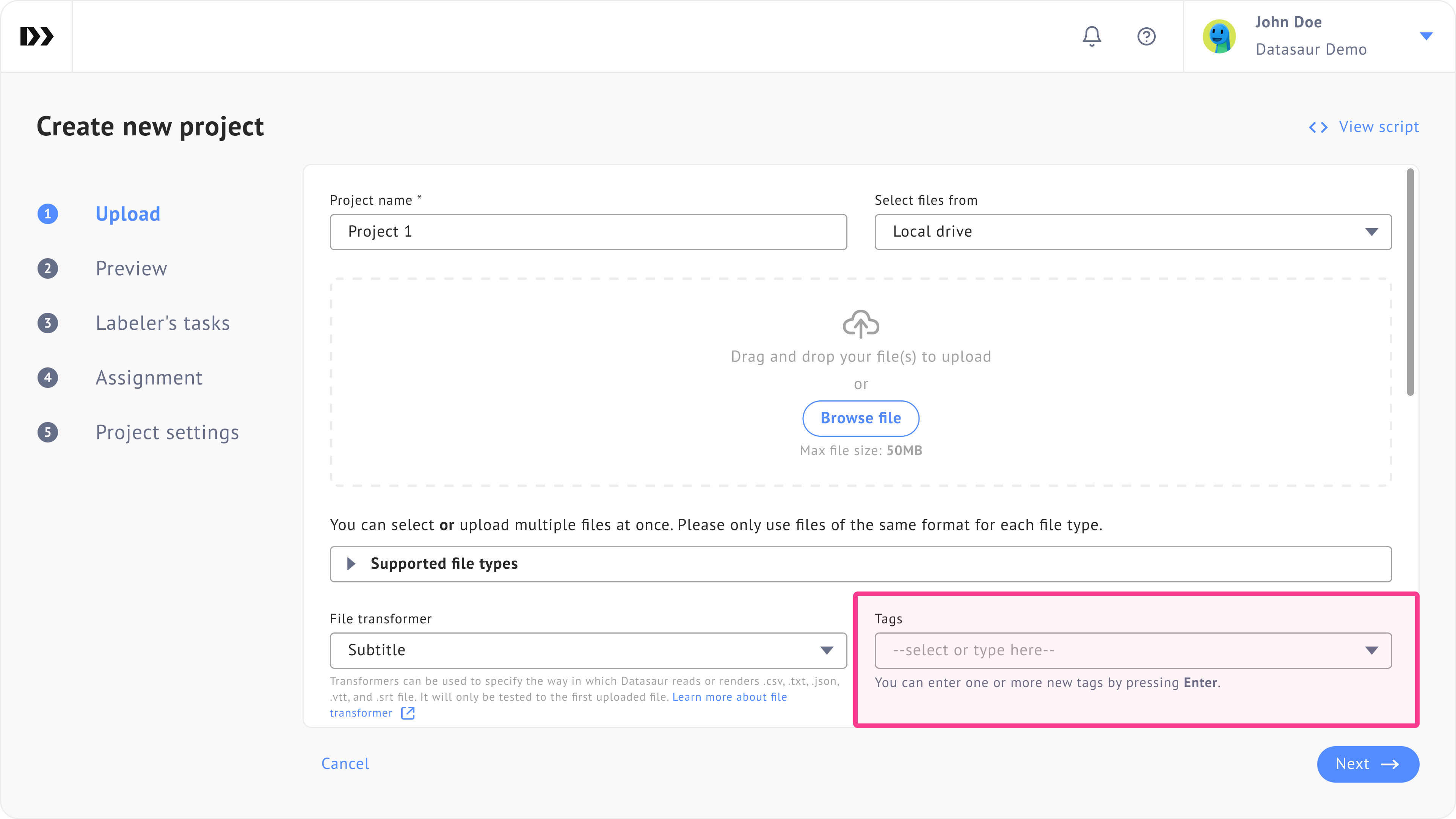 The **second method** is to [add project tags through the project creation wizard step 1.](https://docs.datasaur.ai/data-studio-projects/creating-a-project#add-project-tags)