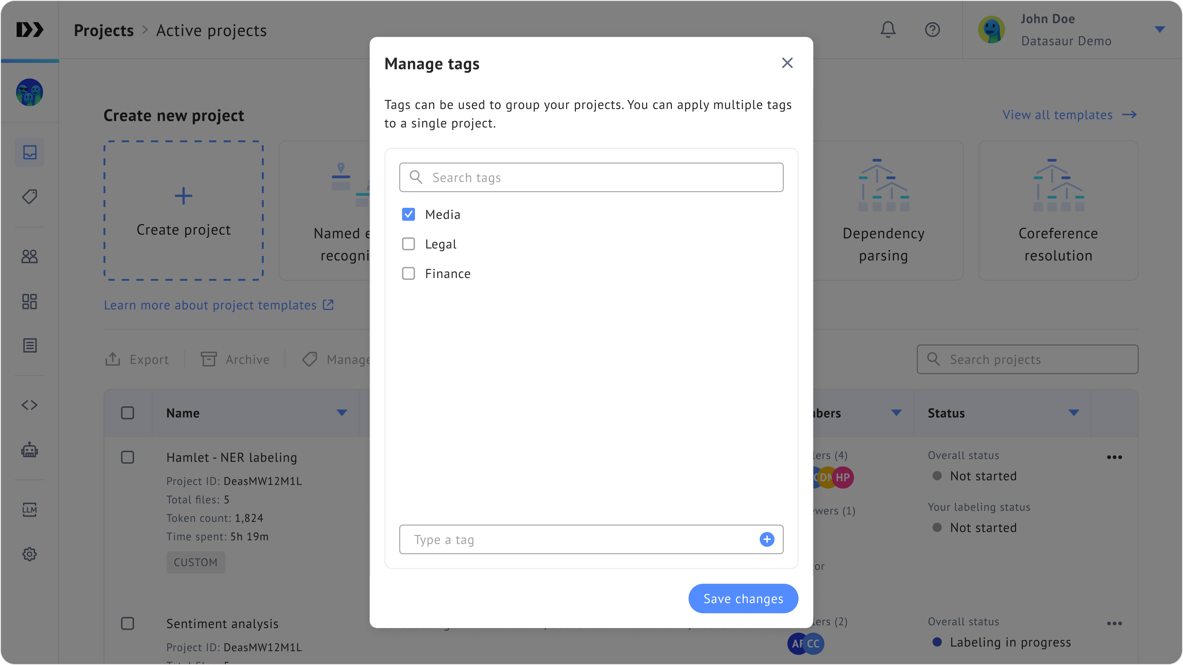 In the example below, we assign `Media` tags to **Hamlet - NER labeling** project.