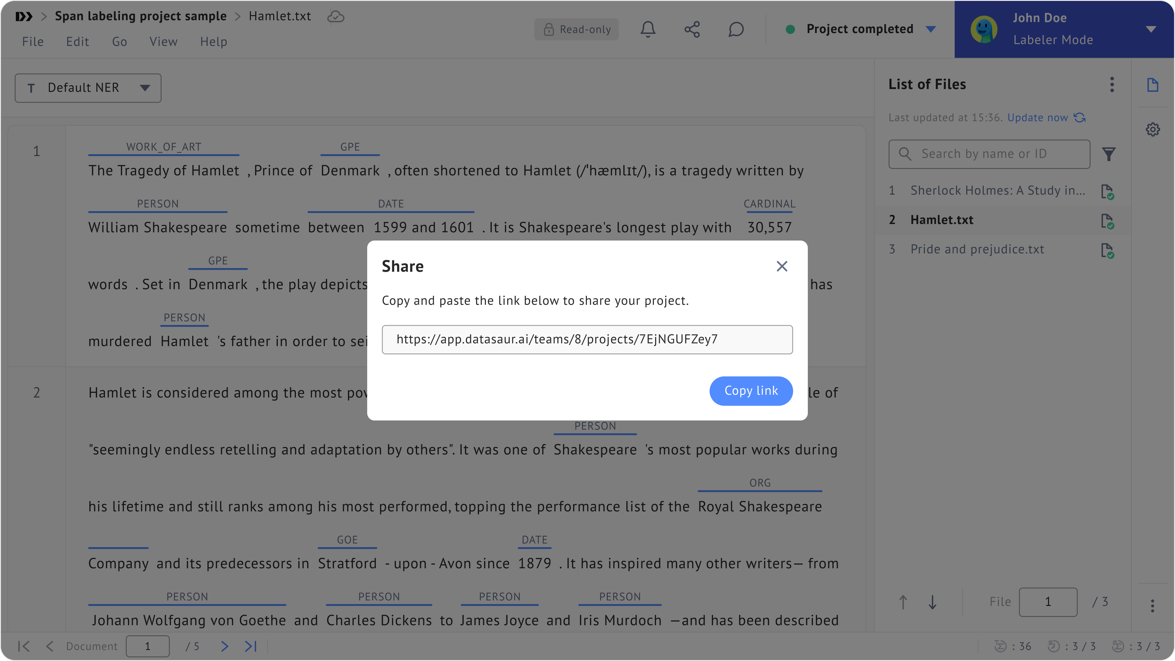 <figure><img src="https://448889121-files.gitbook.io/~/files/v0/b/gitbook-x-prod.appspot.com/o/spaces%2F-MbjY0HseEqu7LtYAt4d%2Fuploads%2Fgit-blob-df422f91de8b8302b4a6549952b3369f6e97f0d7%2FSpan%20labeling%20-%20share.png?alt=media" alt=""><figcaption><p>Share projects via Share icon in the labeling page</p></figcaption></figure>