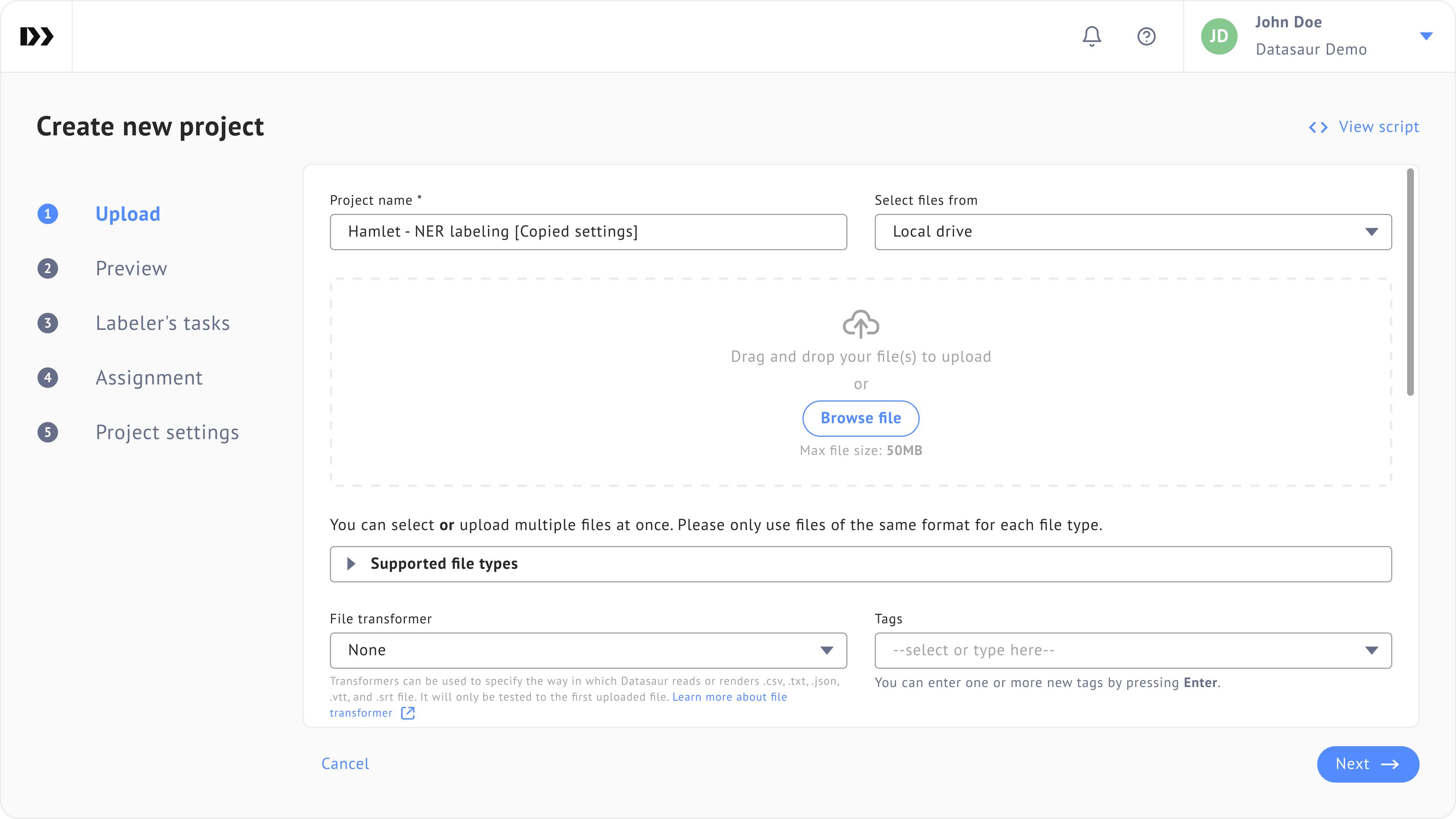 You will be directed to the project creation steps. Notice that the project name has already been filled with the `[Copied settings]` suffix. This means that this new project **will have the same settings** as the **Hamlet - NER labeling** project.