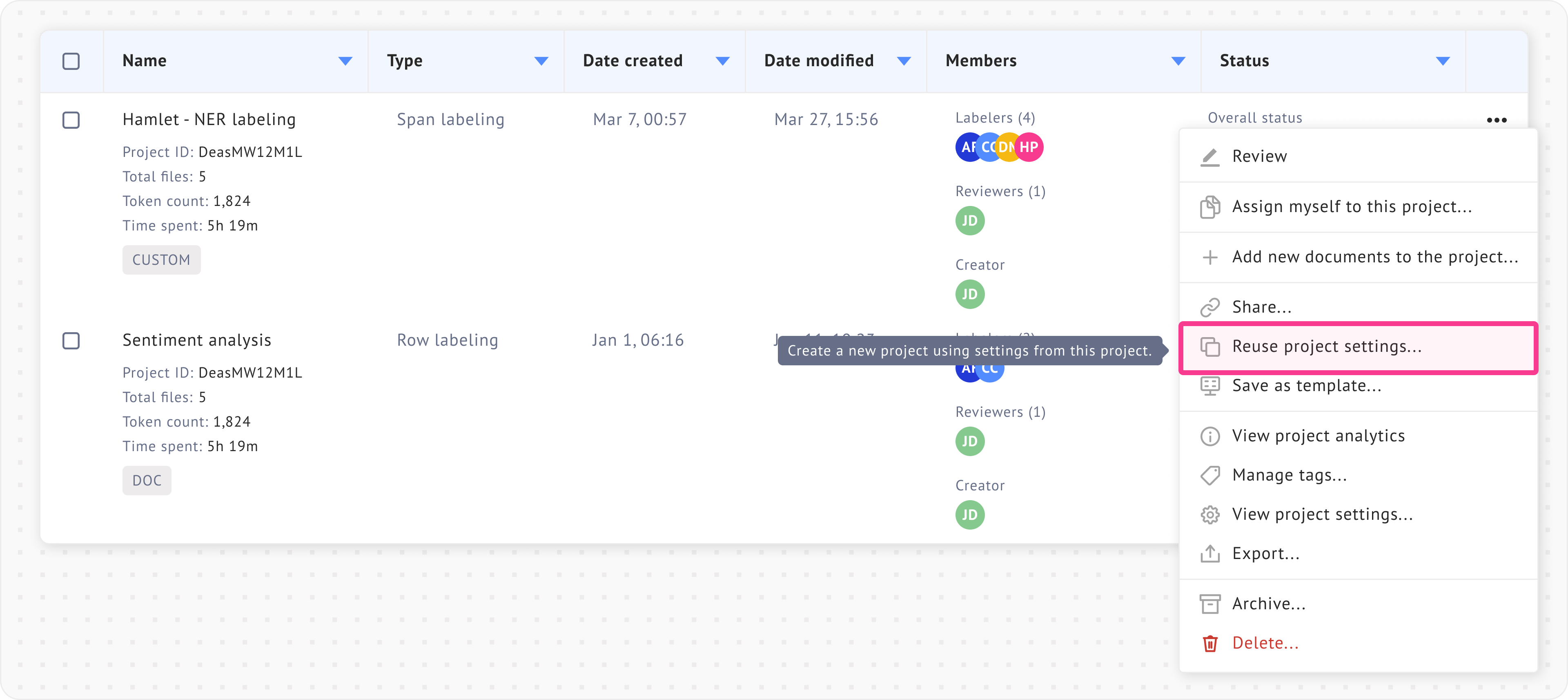 * The project cannot be created successfully if you apply the ‘reuse project settings’ for a different project type. This is because the extension used for a specific project type might not support other project types. For instance, if you use your previous Row Labeling project and apply the ‘reuse project settings’ for a Span Labeling project, it won’t be supported.