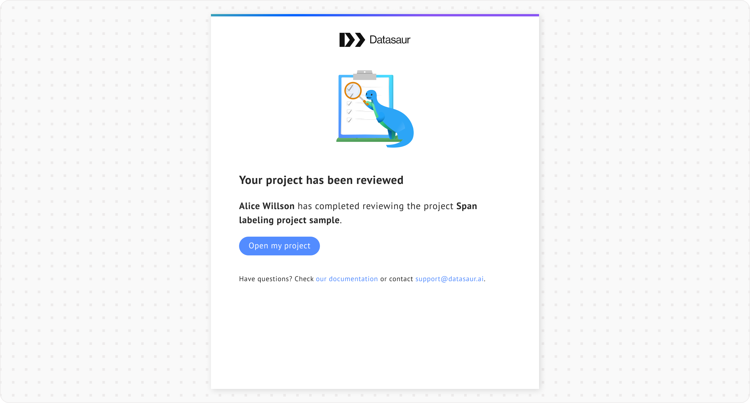 After reviewers mark the project as complete, all labelers assigned to the project will receive an email notification. They can open the project in read-only mode by clicking the link.