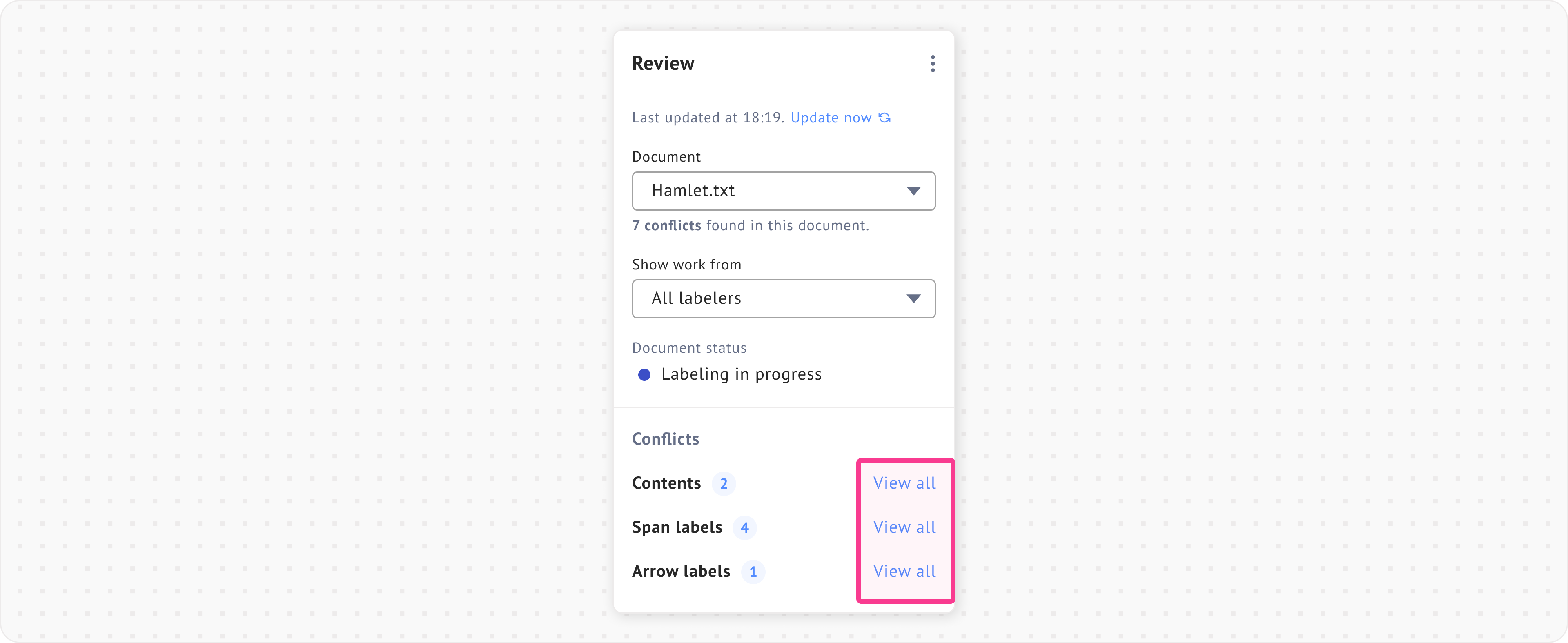 <figure><img src="https://448889121-files.gitbook.io/~/files/v0/b/gitbook-x-prod.appspot.com/o/spaces%2F-MbjY0HseEqu7LtYAt4d%2Fuploads%2Fgit-blob-285ce3b3470374a14d19e7595782d0861dd7c43b%2FExtension%20-%20Review%20-%20span%20labeling%20-%20conflicted%20-%20spans.png?alt=media" alt=""><figcaption></figcaption></figure>