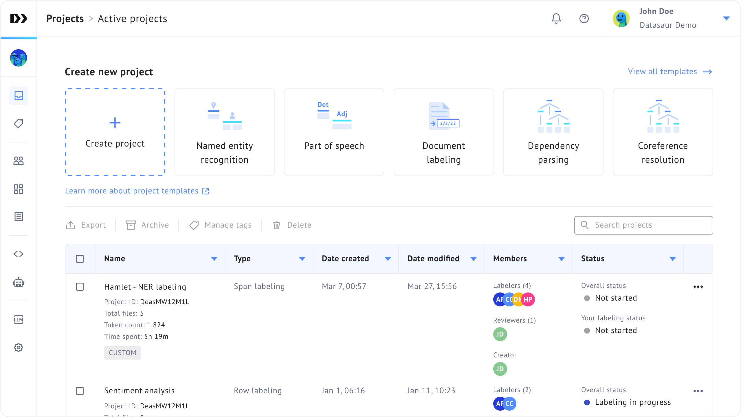 <figure><img src="https://448889121-files.gitbook.io/~/files/v0/b/gitbook-x-prod.appspot.com/o/spaces%2F-MbjY0HseEqu7LtYAt4d%2Fuploads%2Fgit-blob-86c29dd3ce7c46b99fb83cd9a616b08010b76315%2FProjects%20-%20active%20projects.png?alt=media" alt=""><figcaption><p>Datasaur Project List Page</p></figcaption></figure>