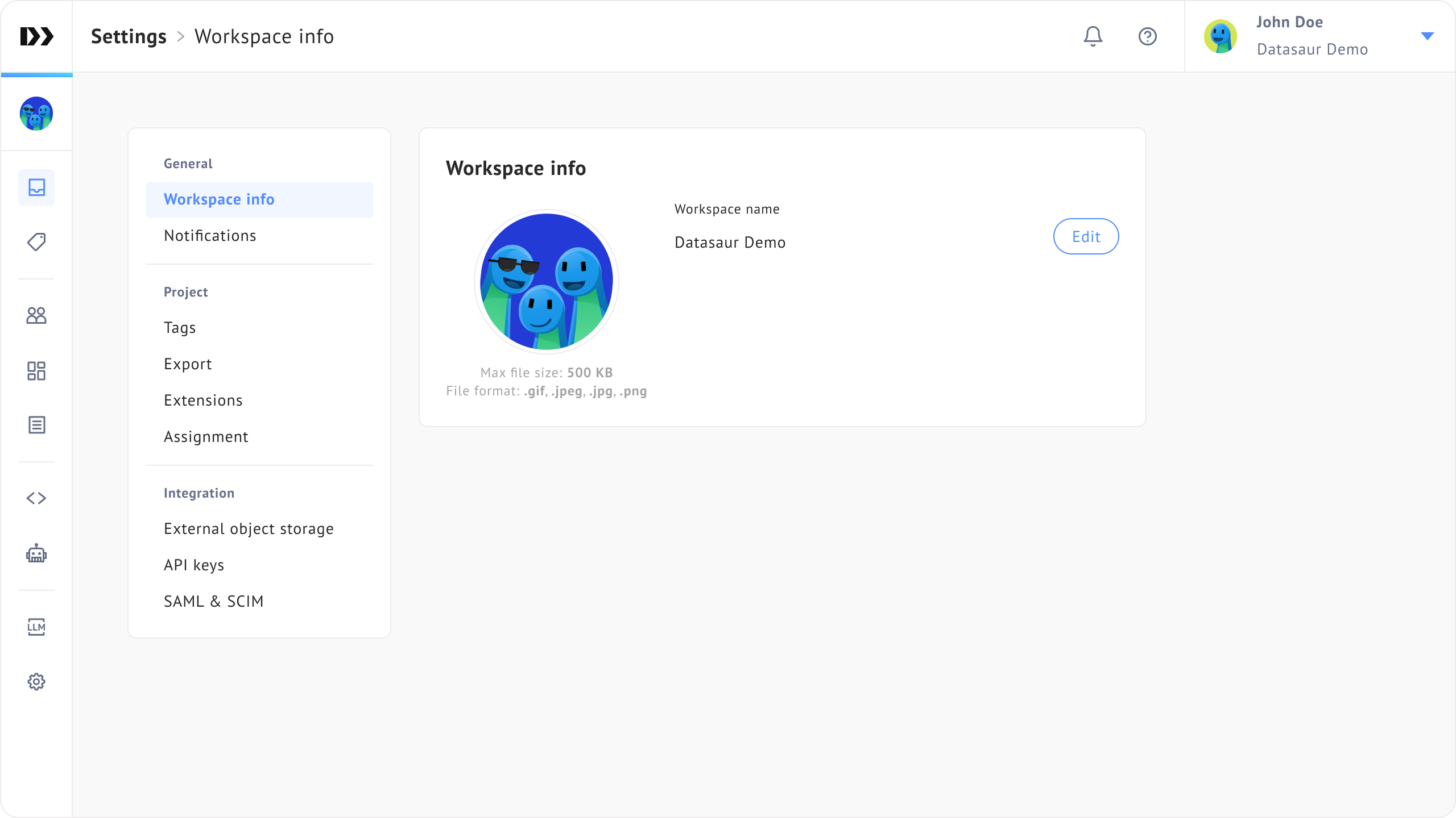 <figure><img src="https://448889121-files.gitbook.io/~/files/v0/b/gitbook-x-prod.appspot.com/o/spaces%2F-MbjY0HseEqu7LtYAt4d%2Fuploads%2Fgit-blob-8841969e10b0a454a2dbea5c89a4dc7606b39680%2FWorkspace%20settings%20-%20workspace%20info.png?alt=media" alt=""><figcaption><p>Datasaur Settings page</p></figcaption></figure>