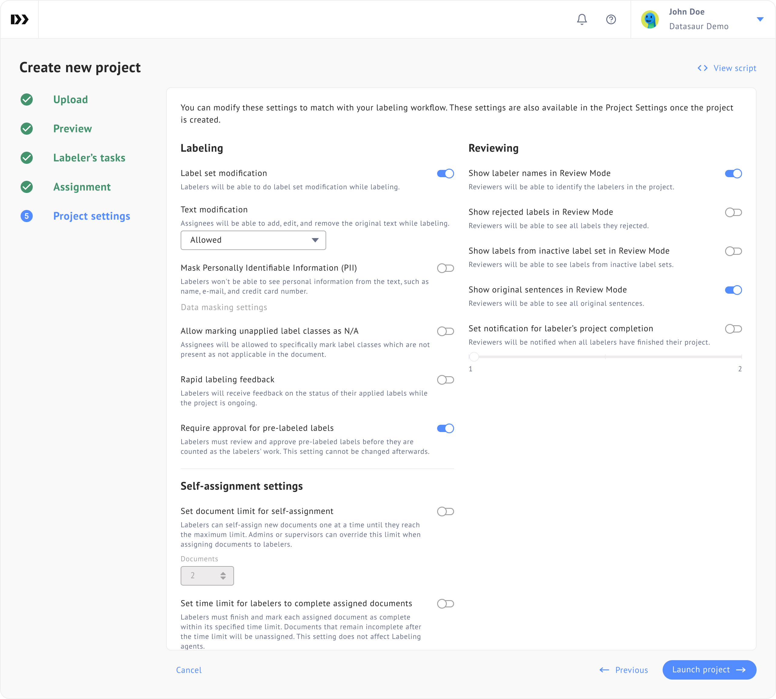 In step 5, you can modify the project settings to match your labeling workflow. These settings are also available in the Project Settings once the project is created.