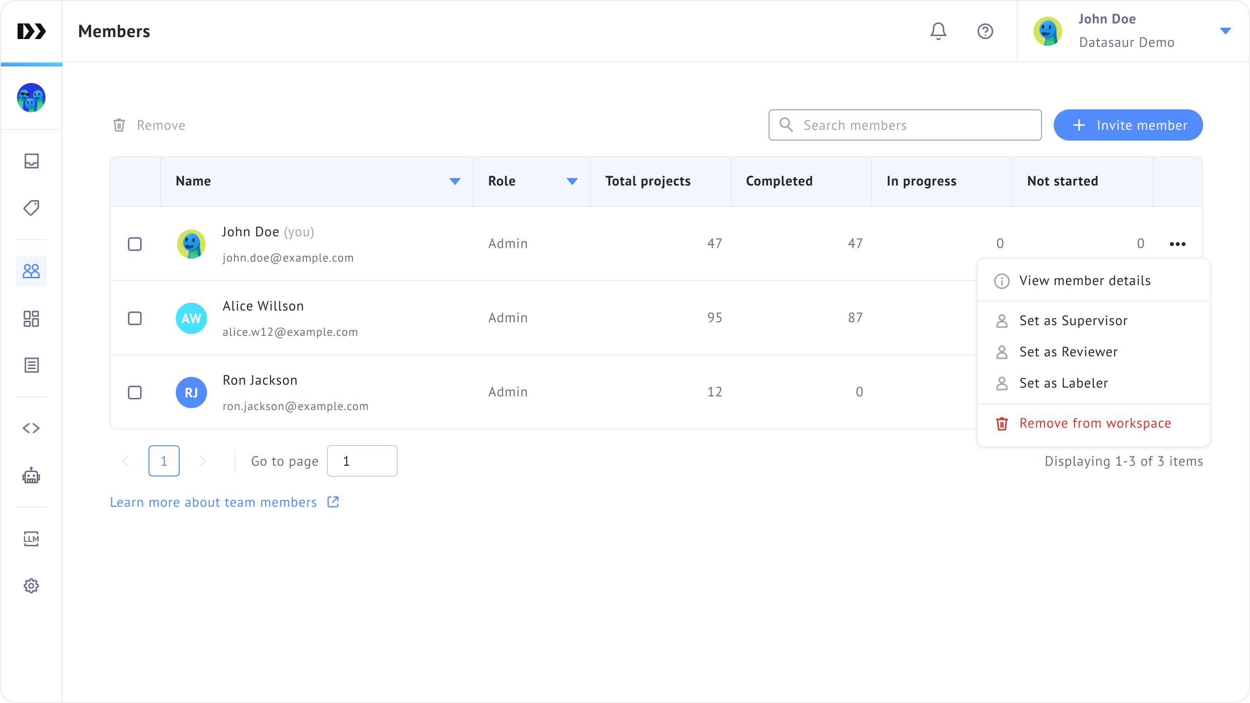 Once you have reached your team workspace, invite your team members by navigating to the **Members** page on the left sidebar and click **Invite member**. In the pop-up, you can enter up to 20 email addresses (separated by commas) and choose a role for the new members, such as **Admin**, **Supervisor**, **Reviewer**, or **Labeler**.