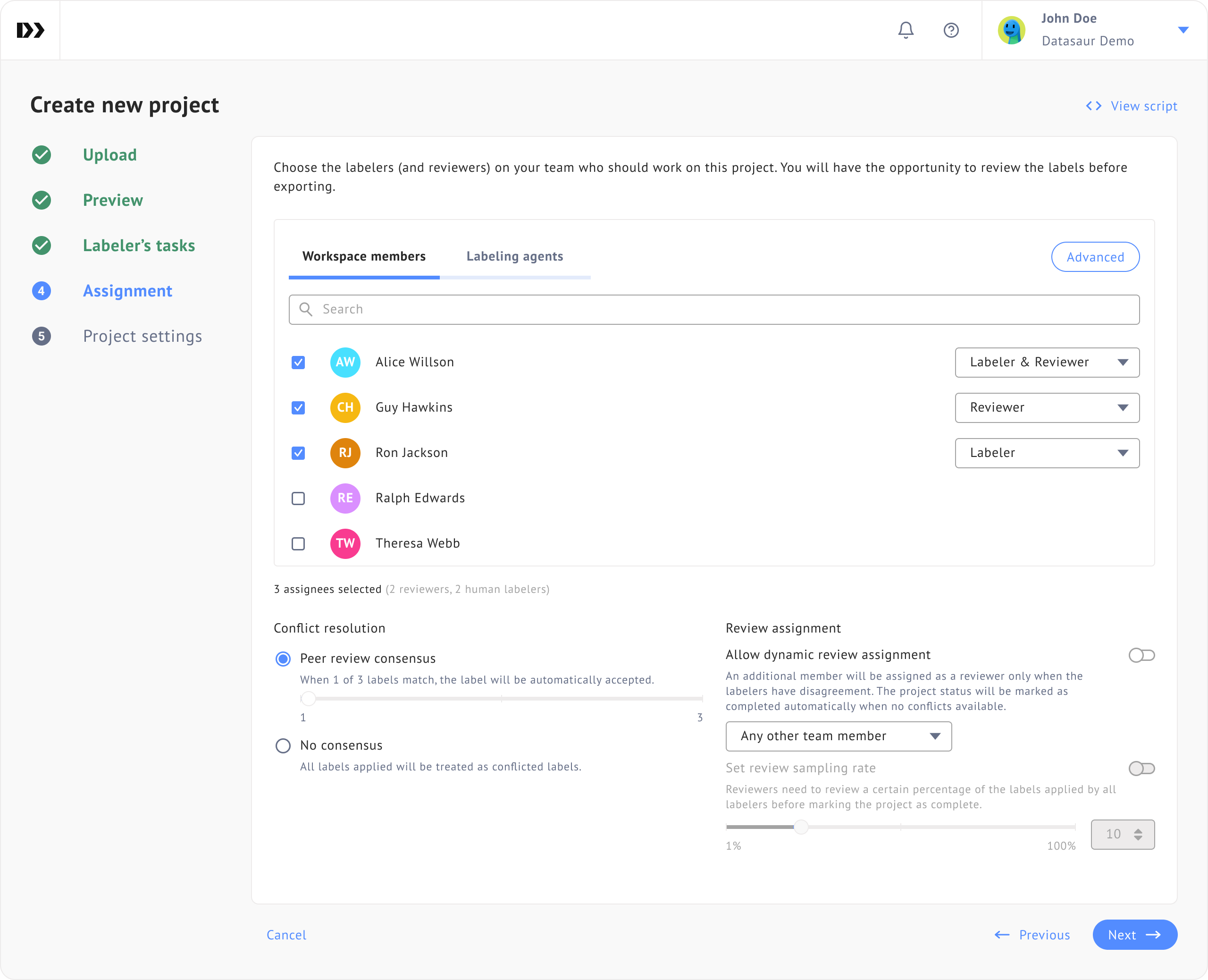 * **Allow dynamic review assignment** allows you to assign your team members' as a reviewer automatically when the labelers **have conflicts** in a project. The detailed information can be found [here](https://docs.datasaur.ai/data-studio-projects/creating-a-project/dynamic-review-capabilities).